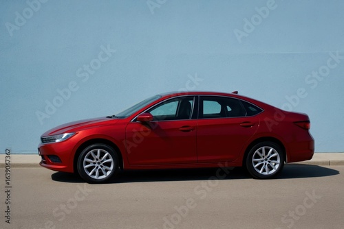 A vibrant red sedan stands out against a serene blue sky, its sleek design reflecting modern automotive elegance