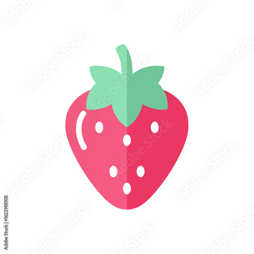 A vibrant red strawberry icon with a fresh green top, depicted in a simple flat vector design style, isolated on a white background.