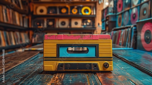 A vibrant retro cassette tape design with colorful vinyl records evokes a sense of nostalgia and creativity, perfect for music lovers