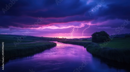 A vibrant river reflects a dramatic sky with purple hues and striking lightning in a scenic landscape at twilight.