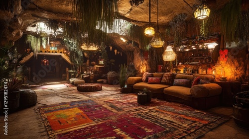 A vibrant room with a comfortable couch, soft rugs, and warm accent lighting.