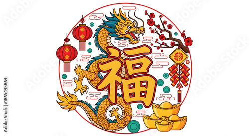 A vibrant round Chinese New Year design featuring a majestic dragon, the 福 fortune character, red lanterns, blossoms, and gold ingots, conveying luck, prosperity, and festive family celebration.