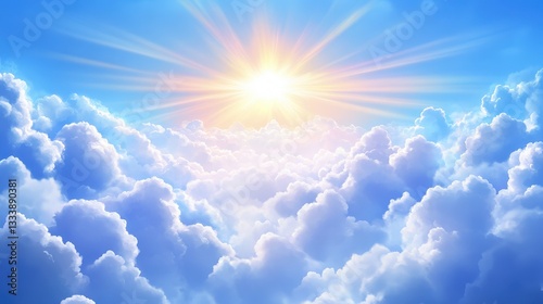 A vibrant sky with fluffy clouds illuminated by a radiant sun, creating a serene and uplifting atmosphere.