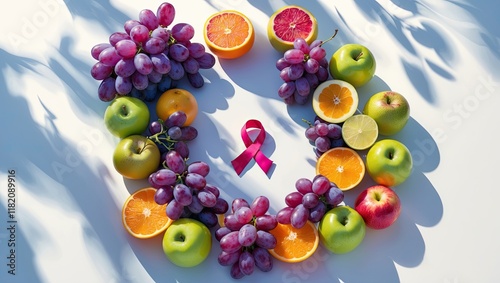 A vibrant still life composition of fresh healthy fruit and a ribbon celebrating world cancer day