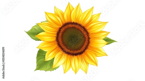 A vibrant sunflower with bright yellow petals and green leaves, symbolizing warmth and positivity in nature.