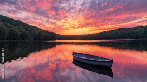 A vibrant sunset reflecting on a calm lake, with pink and orange hues and a lone rowboat drifting peacefully, ideal for serene nature scenes