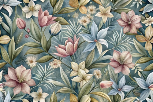 A vibrant tapestry of blooming flowers entwined with lush green leaves, showcasing a harmonious blend of colors and delicate details that evoke a sense of tranquility. Generative AI