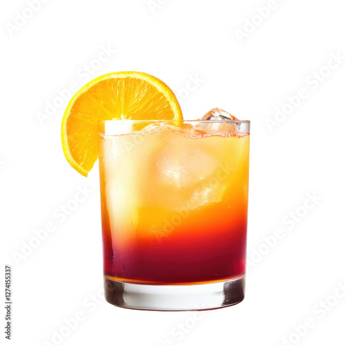 a vibrant tequila sunrise cocktail clipart, gradient orange and red drink, citrus slice garnish, isolated on white background