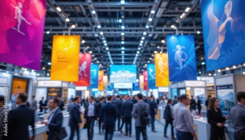 A vibrant trade show hall with colorful banners and blurred businesspeople networking.