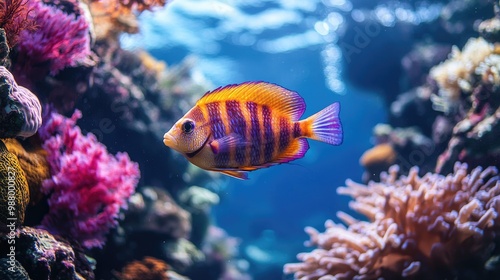 A vibrant underwater scene featuring a colorful fish swimming among coral reefs.
