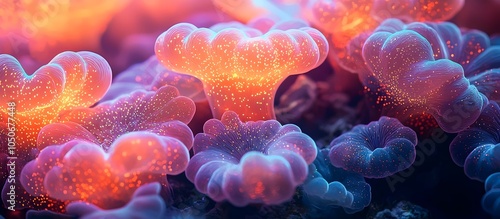 A vibrant underwater scene featuring colorful coral formations illuminated in hues of orange and blue, showcasing the beauty of marine life in a surreal, glowing atmosphere.