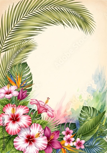 A vibrant watercolor illustration featuring hibiscus flowers, palm leaves, and other tropical elements, perfect for design.