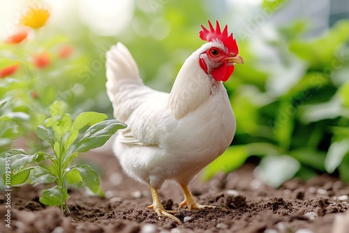A vibrant white chicken roaming freely in a lush garden, showcasing its colorful features and natural environment.