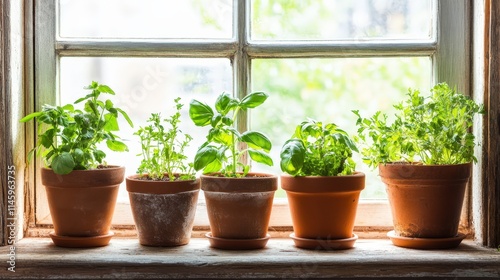 A vibrant windowsill herb garden, featuring pots of basil, mint, and cilantro growing in natural sunlight