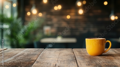 A vibrant yellow coffee mug sits alone on a rustic wooden table, surrounded by a softly blurred background with warm glowing lights, evoking a cozy café atmosphere.