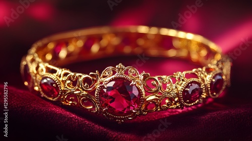 A Victorian-style ruby bracelet with intricate gold filigree, glowing on a deep red background