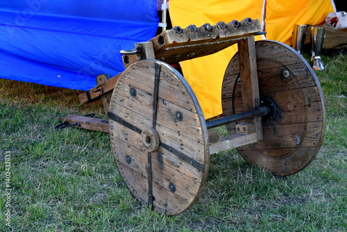 A view of a big multi barreled cannon, bombard or other artillery device on wheels with metal reinforcements located next to a colorful cloth tent seen in summer during a medieval festival in Poland