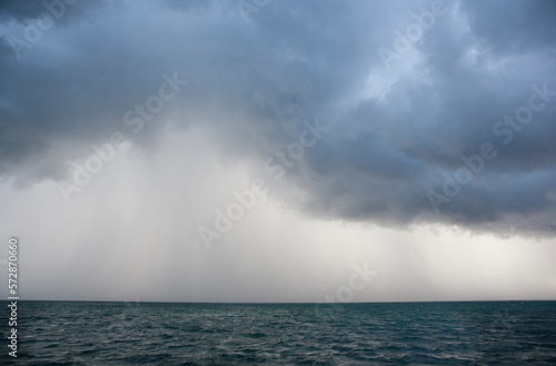 a view of an ocean storm with menacing clouds and rain showering below