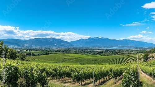 A view of rolling vineyards in a wine region, with mountains in the distance under a bright blue sky.
