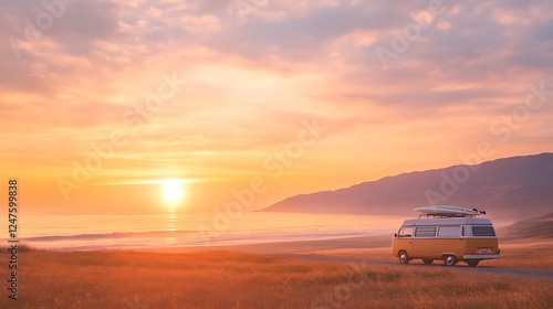 A vintage van parked on a beach at sunset, with golden hues reflecting on the water.