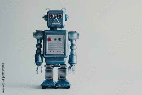 A vintage-style robot with a light blue and silver color scheme. The robot’s boxy, metallic body stands out against a plain, light background. Nostalgia for early robotics and sparking curiosity about