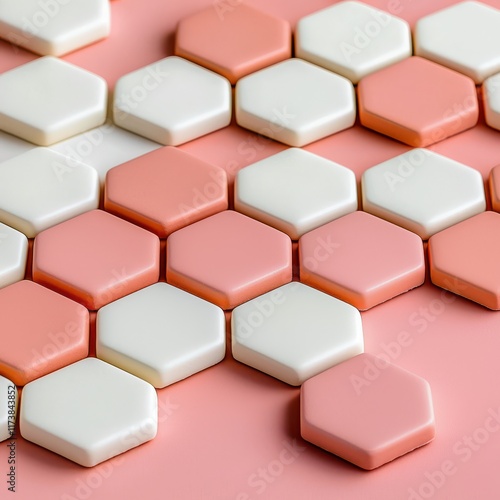 A visually pleasing arrangement of hexagonal tiles in soft pink and white hues on a pastel background, creating a modern and stylish design.