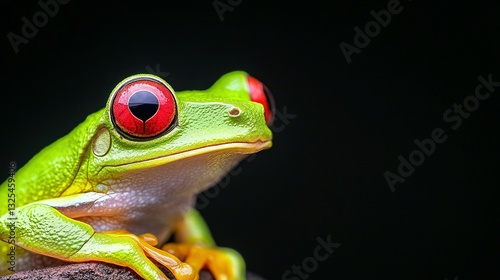 A vivid green frog with striking red eyes poses beautifully