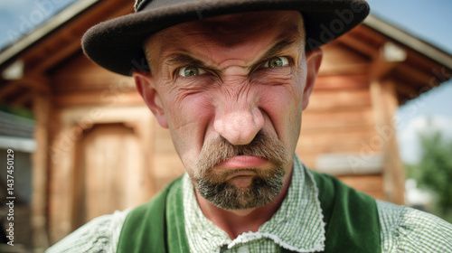 A vivid portrait capturing a very angry farmer with an exaggerated, almost comical expression. Generative AI