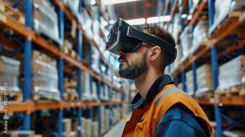 A warehouse employee uses a wearable device with augmented reality (AR) capabilities to receive real-time instructions and guidance for picking and packing tasks.