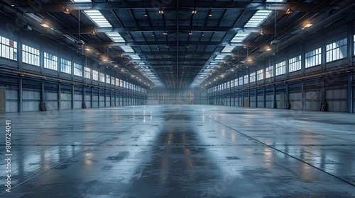 A warehouse with concrete floors and high ceilings exhibited the industrial architecture of an open space, ideal for displaying goods or arranging events, enhancing business shipping transportation.