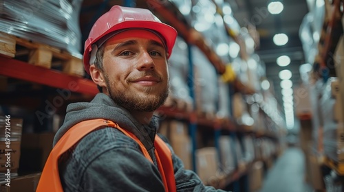 A warehouse worker wearing a pink helmet and orange safety vest, exuding confidence and readiness, standing among shelves stocked with boxes in a busy supply chain environment.