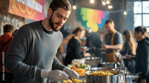 A warm and bustling indoor setup where a volunteer is serving pasta and salad to a family in line, with a colorful banner promoting kindness and charity visible above