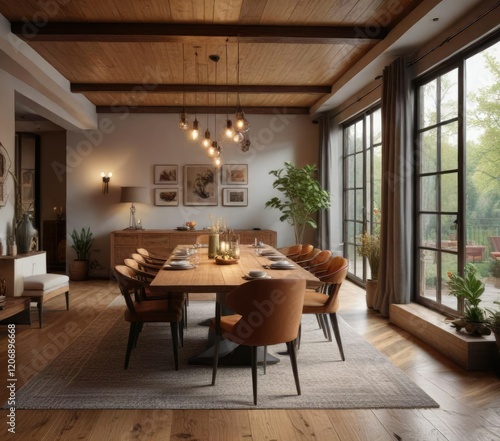 A warm and cozy living room with a big dining table in the center, seasonal tablescape, autumnal ambiance