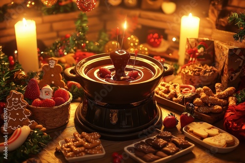 A warm and festive Christmas fondue party, with a chocolate fondue pot surrounded by holiday-themed dippables like gingerbread cookies, strawberries, and pretzels, in a cozy, candle-lit room.
