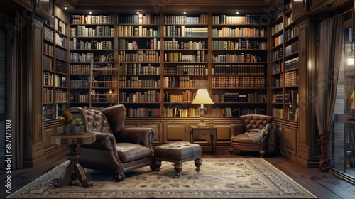 A warm and inviting reading nook nestled within a grand library, complete with plush leather armchairs, a footstool, and a table lamp. The rich wood and soft lighting create an atmosphere