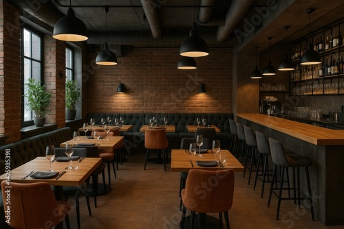 A Warm and Inviting Restaurant Interior Featuring Cozy Seating, Elegant Lighting, and a Stylish Bar Area in a Modern Urban Setting.