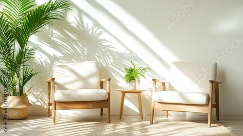 A warm minimalist lounge area welcomes you with its natural elements and simple design, creating a perfect spot for relaxation and reflection in sunlight's embrace.
