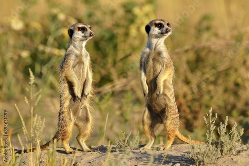 A Watchful Pair: Two meerkats stand vigilant on a sun-drenched plain, embodying the alertness and social bonds of these charismatic creatures.