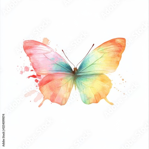 A watercolor butterfly drawn with blots and splashes against a pristine white backdrop