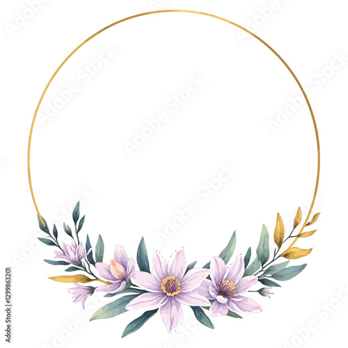 A watercolor illustration of lavender flowers and greenery framing a circular golden border