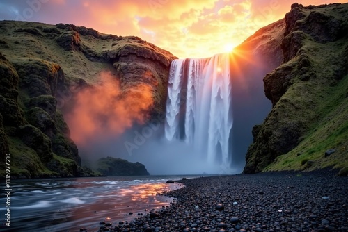 A waterfall with a misty atmosphere at sunrise, soft, dew, sunrise