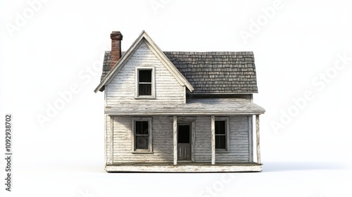 A weathered white farmhouse stands isolated against a stark white background. The aged wood siding and gray roof shingles tell a story of time.