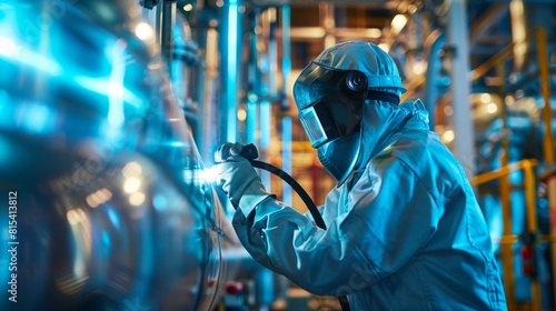 A welder in a protective suit working on the exhaust systems of industrial boilers.