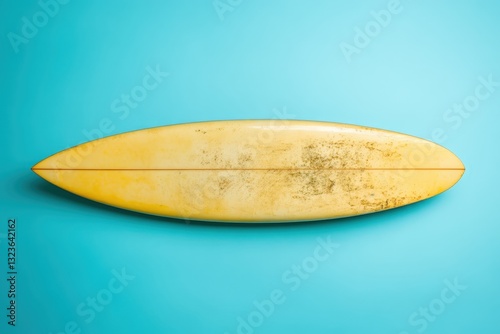 A well used surfboard resting on a solid colored background
