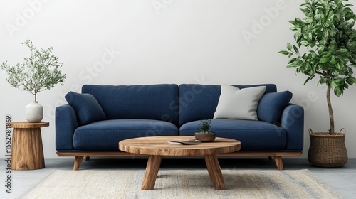 A well-designed living room featuring a comfortable blue sofa, decorative plants, and a stylish coffee table, embodying a serene and modern home environment.