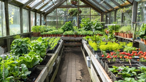 A well-organized greenhouse filled with thriving plants, showcasing a variety of vegetables, herbs, and flowers.