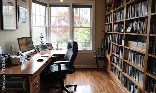 A well-organized home office space, complete with a tidy desk, ergonomic chair, and shelves filled with productivity-boosting books