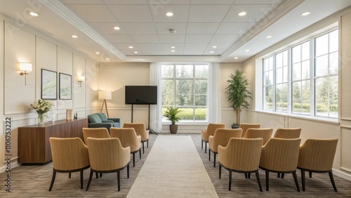 A wellorganized space featuring a large window allowing natural light to illuminate hosts as they connect with their audience.