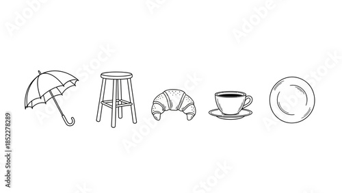 A whimsical collection of everyday objects an umbrella, a stool, a croissant, a coffee cup, and a plate