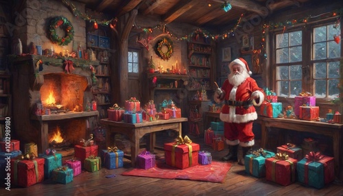 A whimsical depiction of Santa's workshop filled with a variety of colorful Christmas gifts, capturing the magic and excitement of holiday preparations, Generative AI